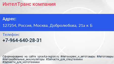 ИнтелТранс, компания по адресу 127254, Россия, Москва, Добролюбова, 21а к Б в дальнейшем Организация, размещена в следующих категориях:
