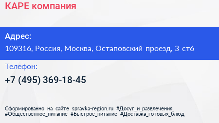 КАРЕ, компания по адресу 109316, Россия, Москва, Остаповский проезд, 3 ст6 в дальнейшем Организация, размещена в следующих категориях: