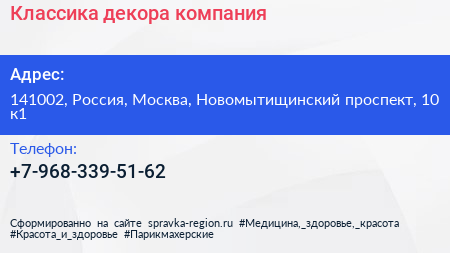 Классика декора, компания по адресу 141002, Россия, Москва, Новомытищинский проспект, 10 к1 в дальнейшем Организация, размещена в следующих категориях:
