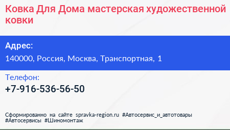 Ковка Для Дома, мастерская художественной ковки по адресу 140000, Россия, Москва, Транспортная, 1 в дальнейшем Организация, размещена в следующих категориях:
