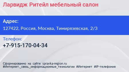Ларвидж Ритейл, мебельный салон по адресу 127422, Россия, Москва, Тимирязевская, 2/3 в дальнейшем Организация, размещена в следующих категориях: