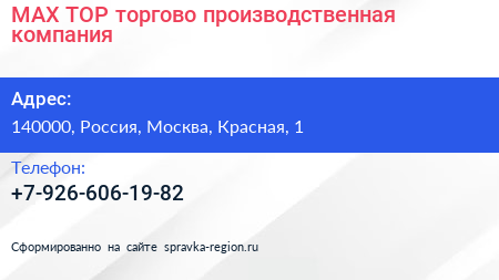 MAX-TOP, торгово-производственная компания по адресу 140000, Россия, Москва, Красная, 1 в дальнейшем Организация, размещена в следующих категориях: