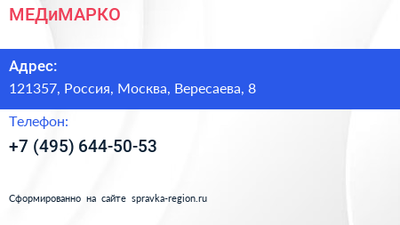 МЕДиМАРКО по адресу 121357, Россия, Москва, Вересаева, 8 в дальнейшем Организация, размещена в следующих категориях: