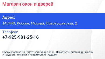 Магазин окон и дверей по адресу 143440, Россия, Москва, Новотушинская, 2 в дальнейшем Организация, размещена в следующих категориях: