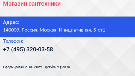 Магазин сантехники по адресу 140009, Россия, Москва, Инициативная, 5 ст1 в дальнейшем Организация, размещена в следующих категориях: