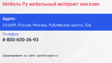 Мебель.Ру, мебельный интернет-магазин по адресу 121609, Россия, Москва, Рублёвское шоссе, 52а в дальнейшем Организация, размещена в следующих категориях: