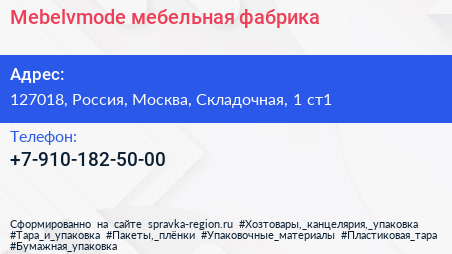 Mebelvmode, мебельная фабрика по адресу 127018, Россия, Москва, Складочная, 1 ст1 в дальнейшем Организация, размещена в следующих категориях: