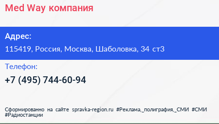 Med-Way, компания по адресу 115419, Россия, Москва, Шаболовка, 34 ст3 в дальнейшем Организация, размещена в следующих категориях: