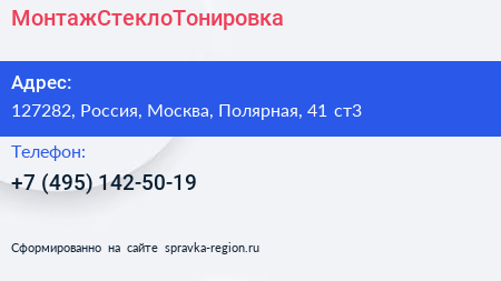 МонтажСтеклоТонировка по адресу 127282, Россия, Москва, Полярная, 41 ст3 в дальнейшем Организация, размещена в следующих категориях:
