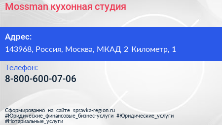 Mossman, кухонная студия по адресу 143968, Россия, Москва, МКАД 2 Километр, 1 в дальнейшем Организация, размещена в следующих категориях: