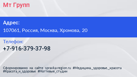 Мт Групп по адресу 107061, Россия, Москва, Хромова, 20 в дальнейшем Организация, размещена в следующих категориях: