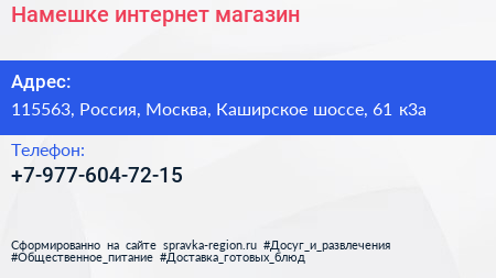 Намешке, интернет-магазин по адресу 115563, Россия, Москва, Каширское шоссе, 61 к3а в дальнейшем Организация, размещена в следующих категориях: