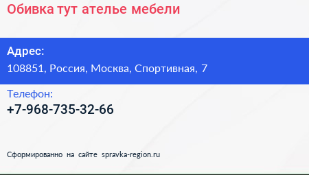 Обивка тут, ателье мебели по адресу 108851, Россия, Москва, Спортивная, 7 в дальнейшем Организация, размещена в следующих категориях: