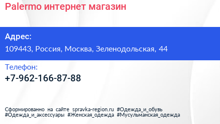 Palermo, интернет-магазин по адресу 109443, Россия, Москва, Зеленодольская, 44 в дальнейшем Организация, размещена в следующих категориях: