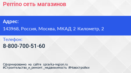 Perrino, сеть магазинов по адресу 143968, Россия, Москва, МКАД 2 Километр, 2 в дальнейшем Организация, размещена в следующих категориях: