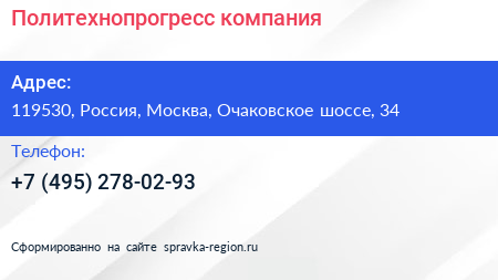 Политехнопрогресс, компания по адресу 119530, Россия, Москва, Очаковское шоссе, 34 в дальнейшем Организация, размещена в следующих категориях:
