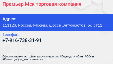 Премьер-Мск, торговая компания по адресу 111123, Россия, Москва, шоссе Энтузиастов, 56 ст11 в дальнейшем Организация, размещена в следующих категориях: