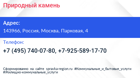 Природный камень по адресу 143966, Россия, Москва, Парковая, 4 в дальнейшем Организация, размещена в следующих категориях:
