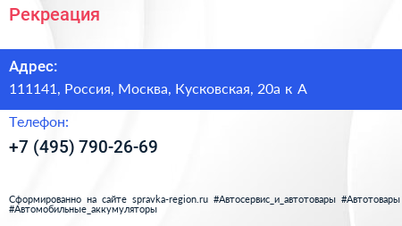 Рекреация по адресу 111141, Россия, Москва, Кусковская, 20а к А в дальнейшем Организация, размещена в следующих категориях:
