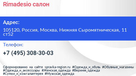 Rimadesio, салон по адресу 105120, Россия, Москва, Нижняя Сыромятническая, 11 ст52 в дальнейшем Организация, размещена в следующих категориях: