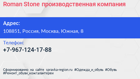 Roman Stone, производственная компания по адресу 108851, Россия, Москва, Южная, 8 в дальнейшем Организация, размещена в следующих категориях: