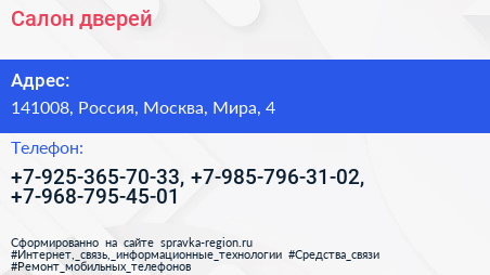 Салон дверей по адресу 141008, Россия, Москва, Мира, 4 в дальнейшем Организация, размещена в следующих категориях: