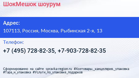 ШокМешок, шоурум по адресу 107113, Россия, Москва, Рыбинская 2-я, 13 в дальнейшем Организация, размещена в следующих категориях: