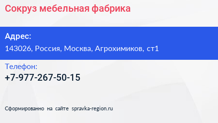 Сокруз, мебельная фабрика по адресу 143026, Россия, Москва, Агрохимиков, ст1 в дальнейшем Организация, размещена в следующих категориях: