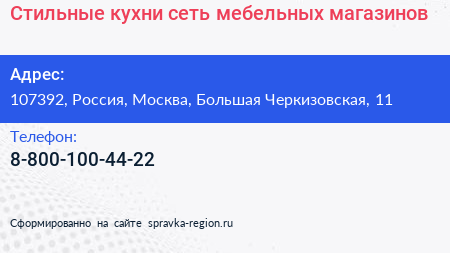 Стильные кухни, сеть мебельных магазинов по адресу 107392, Россия, Москва, Большая Черкизовская, 11 в дальнейшем Организация, размещена в следующих категориях: