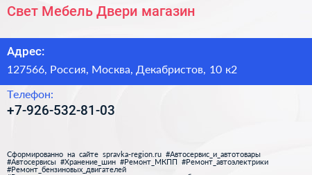 Свет. Мебель. Двери., магазин по адресу 127566, Россия, Москва, Декабристов, 10 к2 в дальнейшем Организация, размещена в следующих категориях: