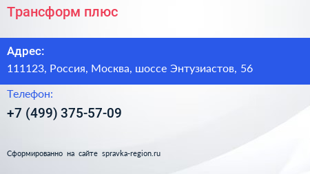 Трансформ плюс по адресу 111123, Россия, Москва, шоссе Энтузиастов, 56 в дальнейшем Организация, размещена в следующих категориях: