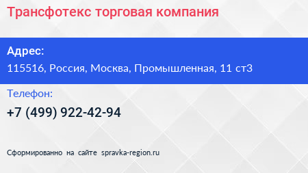 Трансфотекс, торговая компания по адресу 115516, Россия, Москва, Промышленная, 11 ст3 в дальнейшем Организация, размещена в следующих категориях: