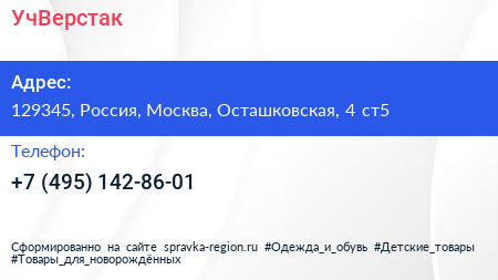 УчВерстак по адресу 129345, Россия, Москва, Осташковская, 4 ст5 в дальнейшем Организация, размещена в следующих категориях: