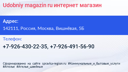 Udobniy-magazin.ru, интернет-магазин по адресу 142111, Россия, Москва, Вишнёвая, 5Б в дальнейшем Организация, размещена в следующих категориях: