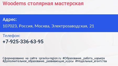 Woodems, столярная мастерская по адресу 107023, Россия, Москва, Электрозаводская, 21 в дальнейшем Организация, размещена в следующих категориях: