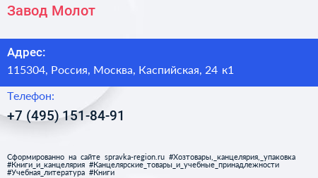 Завод Молот по адресу 115304, Россия, Москва, Каспийская, 24 к1 в дальнейшем Организация, размещена в следующих категориях: