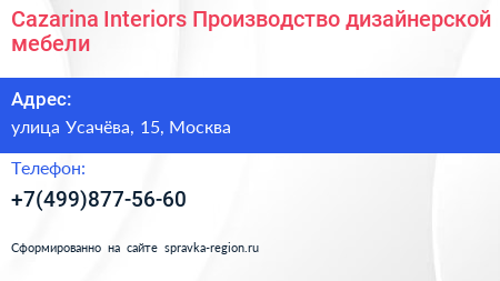 Cazarina Interiors - Производство дизайнерской мебели по адресу улица Усачёва, 15, Москва в дальнейшем Организация, размещена в следующих категориях: