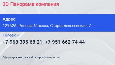 3D Панорама, компания по адресу 129626, Россия, Москва, Староалексеевская, 7 в дальнейшем Организация, размещена в следующих категориях:
