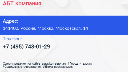 АБТ, компания по адресу 141402, Россия, Москва, Московская, 14 в дальнейшем Организация, размещена в следующих категориях: