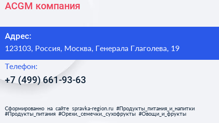 ACGM, компания по адресу 123103, Россия, Москва, Генерала Глаголева, 19 в дальнейшем Организация, размещена в следующих категориях: