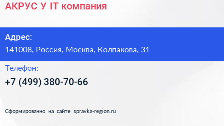 АКРУС-У, IT-компания по адресу 141008, Россия, Москва, Колпакова, 31 в дальнейшем Организация, размещена в следующих категориях:
