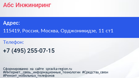 Абс-Инжиниринг по адресу 115419, Россия, Москва, Орджоникидзе, 11 ст1 в дальнейшем Организация, размещена в следующих категориях: