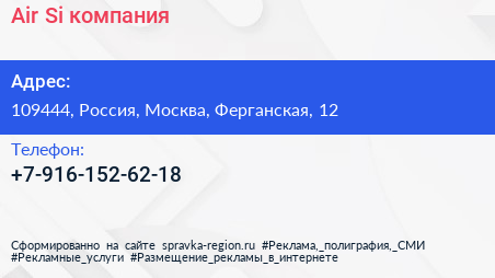 Air Si, компания по адресу 109444, Россия, Москва, Ферганская, 12 в дальнейшем Организация, размещена в следующих категориях: