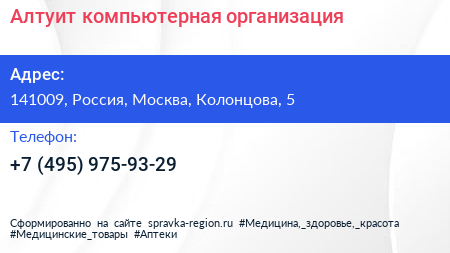 Алтуит, компьютерная организация по адресу 141009, Россия, Москва, Колонцова, 5 в дальнейшем Организация, размещена в следующих категориях: