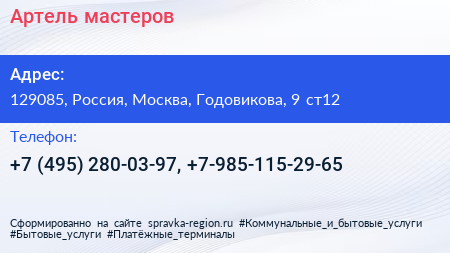 Артель мастеров по адресу 129085, Россия, Москва, Годовикова, 9 ст12 в дальнейшем Организация, размещена в следующих категориях:
