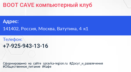 BOOT CAVE, компьютерный клуб по адресу 141402, Россия, Москва, Ватутина, 4 к1 в дальнейшем Организация, размещена в следующих категориях:
