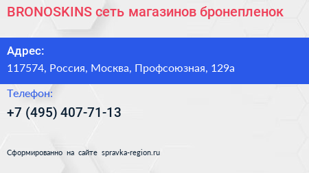 BRONOSKINS, сеть магазинов бронепленок по адресу 117574, Россия, Москва, Профсоюзная, 129а в дальнейшем Организация, размещена в следующих категориях: