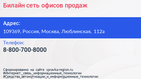 Билайн, сеть офисов продаж по адресу 109369, Россия, Москва, Люблинская, 112а в дальнейшем Организация, размещена в следующих категориях: