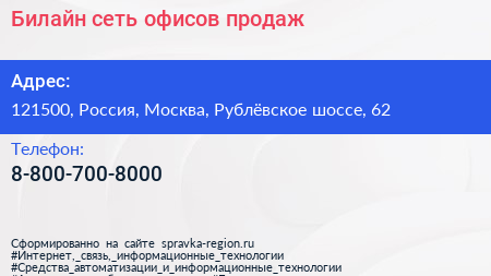 Билайн, сеть офисов продаж по адресу 121500, Россия, Москва, Рублёвское шоссе, 62 в дальнейшем Организация, размещена в следующих категориях: