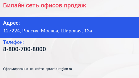 Билайн, сеть офисов продаж по адресу 127224, Россия, Москва, Широкая, 13а в дальнейшем Организация, размещена в следующих категориях: